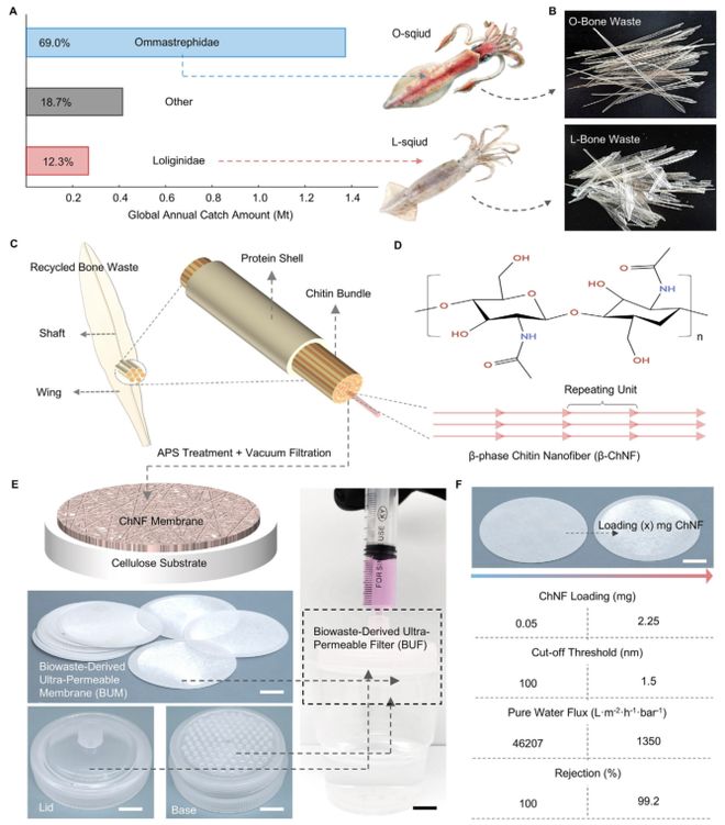 图1:从鱿鱼骨生物废弃物到过滤系统的路径 A) 全球鱿鱼年捕捞量。 B) 枪乌贼(L-squid)和柔鱼(O-squid)及其骨骼照片。 C) β-甲壳素纳米纤维(β-ChNF)与骨骼结构关系示意图。 D) β-ChNF的化学结构。 E) 生物废弃物超渗透过滤器(BUF)示意图及注射器装置照片(比例尺:1厘米)。 F) 不同ChNF负载量下BUM的性能(比例尺:1厘米)。