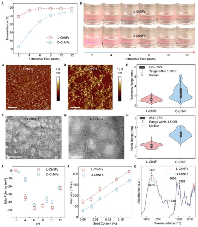 研究对比枪乌贼(Loliginidae)和柔鱼(Ommastrephidae)来源的ChNF(图2)。L-ChNF经2分钟超声透光率达89.3%,纤维更细(平均厚1.2±0.4纳米,宽2.2±0.5纳米),25%纤维仅0.8纳米厚,创纤维材料最薄纪录(图2A-H)。其羧基含量(1.49 mmol·g⁻¹)和zeta电位(-49 mV)更高,增强了胶体稳定性和静电斥力(图2I-K)。由此制备的L-BUM孔隙率达74.8%(O-BUM仅33.6%),表面粗糙度仅1.5纳米(图3D-F)。超高孔隙率推动纯水通量突破46,207 L·m⁻²·h⁻¹·bar⁻¹,超越所有已报道纳米滤膜10倍以上(图3G)。