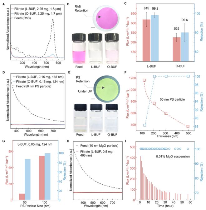 图4:BUF水净化性能 A–C) 2.25毫克ChNF膜对罗丹明B的紫外光谱(A)、截留效果照片(B)及通量/截留率(C)。 D–F) 0.15毫克ChNF膜对50纳米聚苯乙烯颗粒的紫外光谱(D)、截留效果照片(E)及L-BUF通量/截留率(F)。 G) 0.05毫克ChNF膜对50/100纳米颗粒的截留性能。 H,I) 0.5毫克ChNF膜对10纳米氧化镁的紫外光谱(H)及长期通量/截留率(I)。