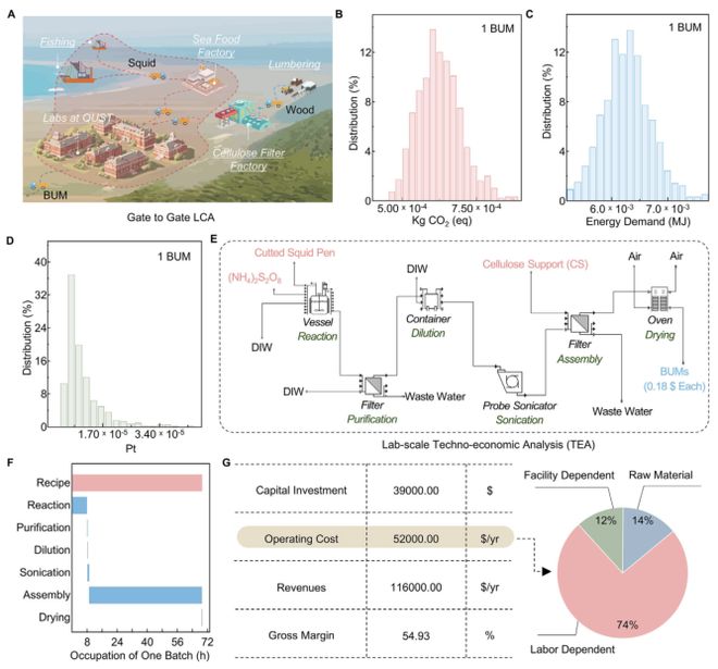 图5:L-BUM的可持续性评估 A) 单片BUM的门到门生命周期评估边界示意图。 B–D) 碳排放(B)、能耗(C)和生态损害潜力(D)的不确定性分析。 E) 实验室规模BUF生产流程。 F) 单批次生产(6克鱿鱼骨→14,000片BUM)设备占用时间。 G) BUM生产的经济效益报告。