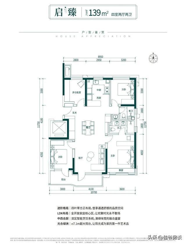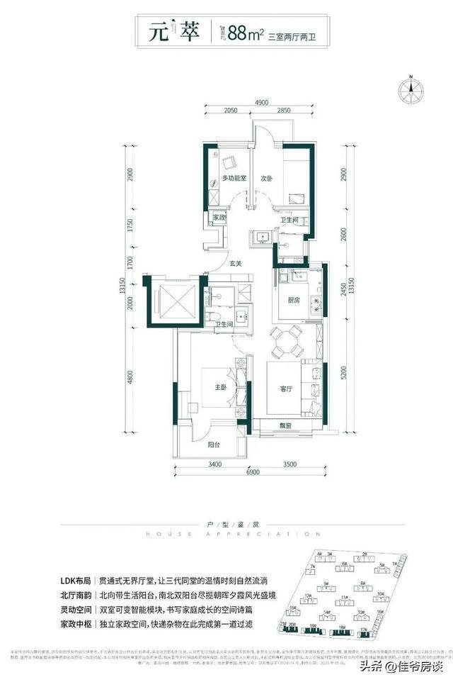 该户型不同于以往产品,有南北阳台。计入赠送阳台的使用空间,整体户型使用空间差不多在90%左右。