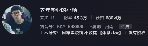 这事儿在网上炸开了锅。小杨的抖音账号简介写着“失业土木研究生,回家卖烧饼”,本身就充满反差和话题性,配上那些奇特烧饼,短短两个月,粉丝蹭蹭涨到40多万。