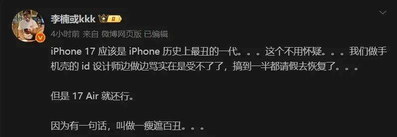 iPhone 17 Air的颜值,则获得了不少网友认可,毕竟「一瘦遮百丑」,轻薄设计本身就很加分。同时,它还是 4 款机型中,唯一保留钛合金材质中框的机型。