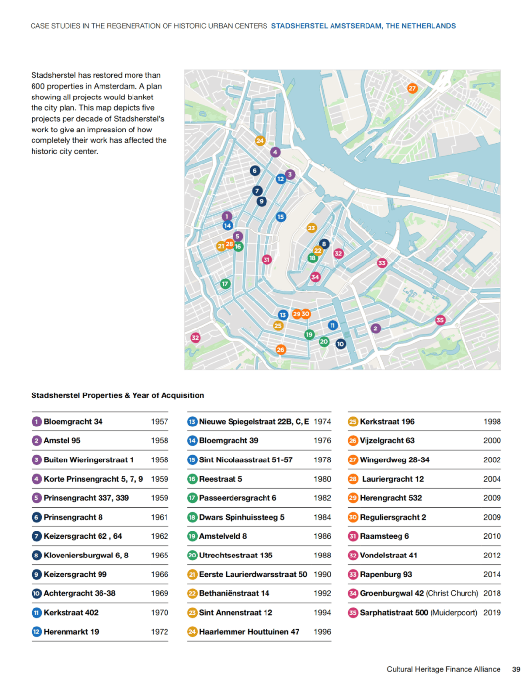 帕拉马里博:2011年10月25日,成立Stichting Stadsherstel Paramaribo基金会(现在是有限公司),由本地7家企业注资,每家出资5万欧元,最大的私人银行De Surinaamsche Bank是其股东之一。目前正在修复第五个房产项目。荷兰本土的乌得勒支、海牙和代尔夫特等城市复制了Stadsherstel类似的成功,但在不同的国家体制中,类似的实施模式会面临来自不同法律与政治环境所带来的挑战。毫无疑问,荷兰发达的文化遗产支持生态系统、公众参与和金融创新是Stadsherstel公司竞争优势、持久性和成功的关键因素。但如果没有私营企业的参与和致力于公共利益的盈利商业实践的应用,也难以成功。Stadsherstel已经成功修复了阿姆斯特丹的600多处房产。下图展示了其部分项目的所在位置,在每十年中选取了5个代表项目,可以看出其对阿姆斯特丹历史城区核心区的影响。