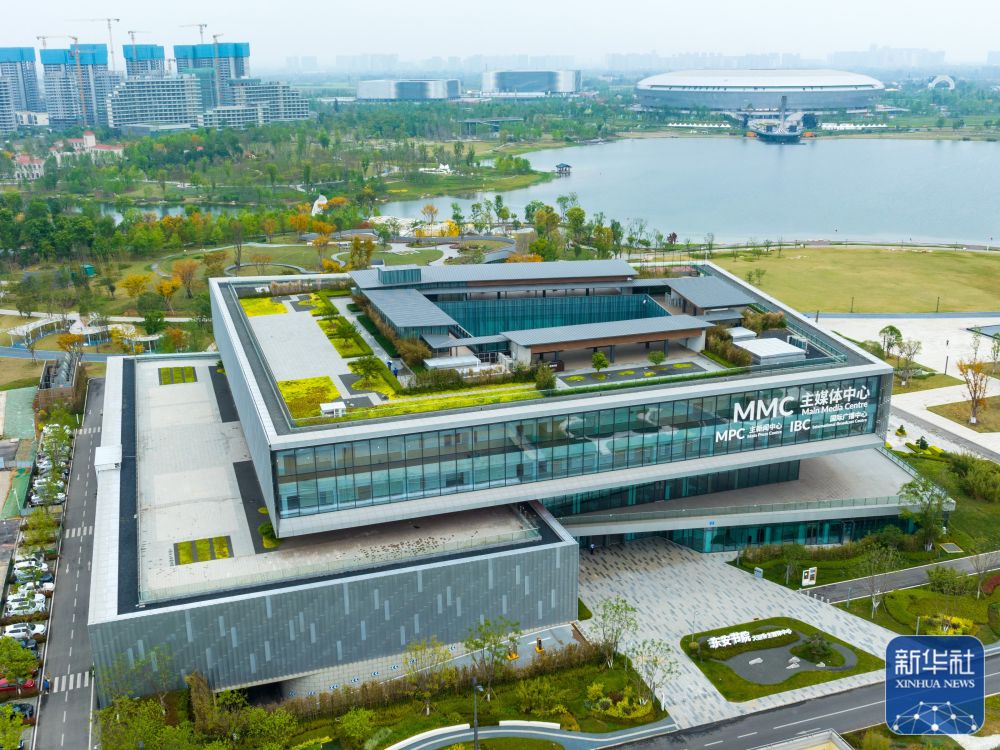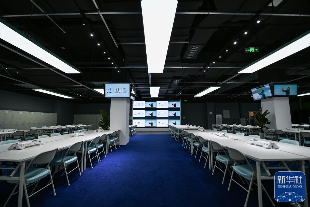 新华社记者带您来大运会主媒体中心一探究竟 主媒体中心北邻东安湖与开幕式场馆东安湖体育公园主体育场及火炬塔隔湖相望