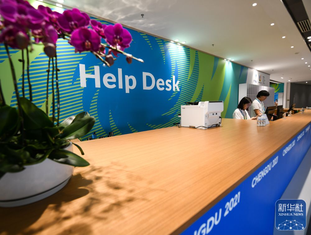 7月13日,在成都大运会主媒体中心,工作人员正在服务台工作。新华社记者 王曦 摄