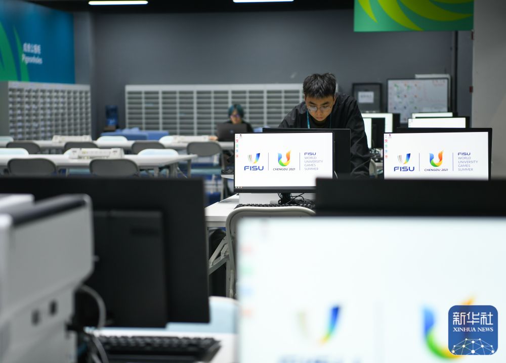 7月13日,在成都大运会主媒体中心,工作人员正在调试媒体工作间的电脑。新华社记者 王曦 摄