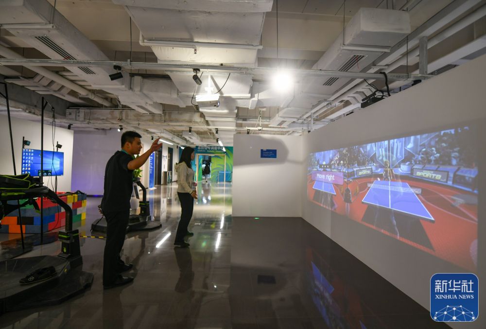7月13日,在成都大运会主媒体中心的休闲娱乐区,两名媒体记者在体验互动投影乒乓球。新华社记者 王曦 摄