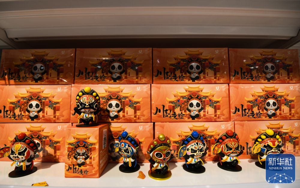 这是7月13日拍摄的成都大运会主媒体中心大运会官方特许商品零售店展出的“蓉宝”川剧变脸造型玩偶。新华社记者 王曦 摄
