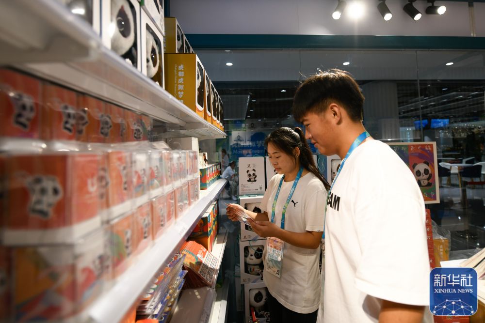 7月14日,媒体工作人员在成都大运会主媒体中心大运会官方特许商品零售店内选购纪念品。新华社记者 胥冰洁 摄