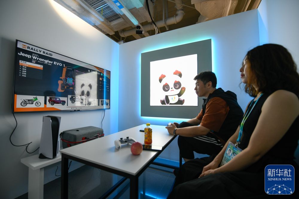 7月14日,媒体工作人员在成都大运会主媒体中心休闲娱乐区内游玩。新华社记者 胥冰洁 摄