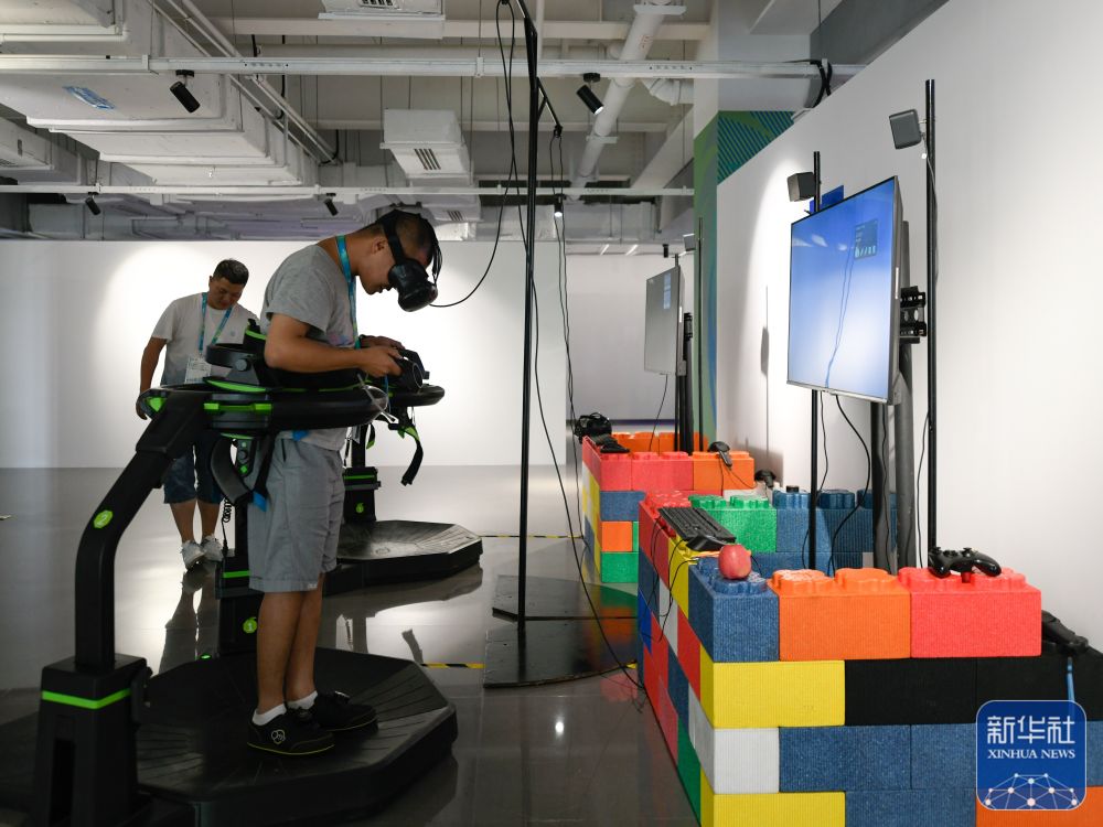 7月14日,媒体工作人员在成都大运会主媒体中心休闲娱乐区内体验VR游戏。新华社记者 胥冰洁 摄