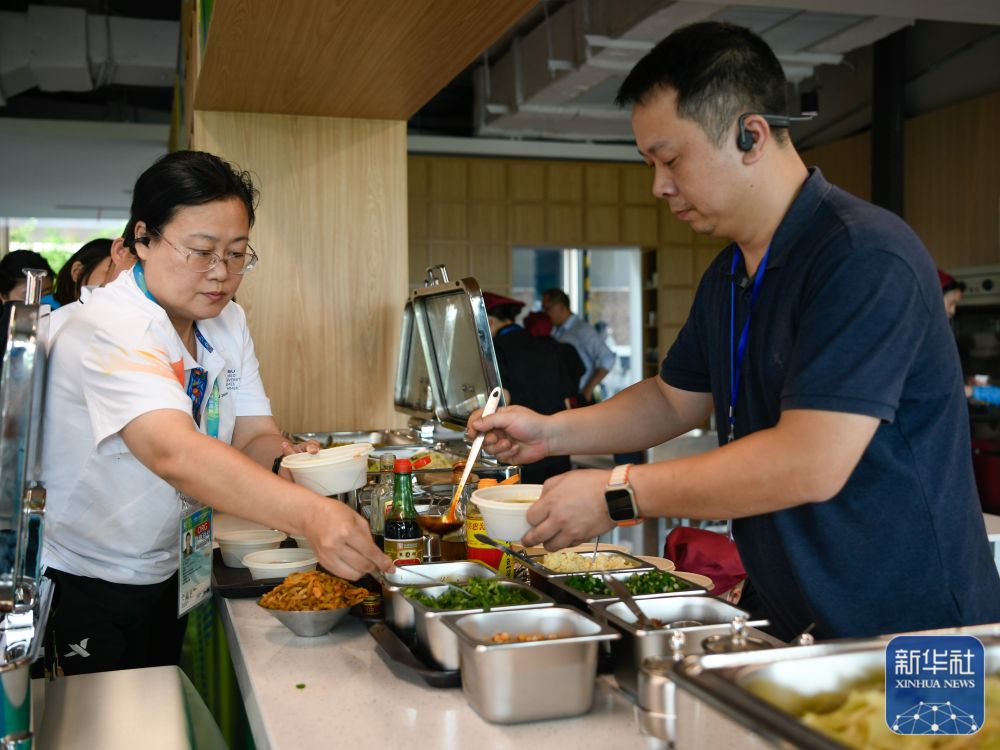 7月14日,工作人员在成都大运会主媒体中心媒体餐厅内就餐。新华社记者 胥冰洁 摄