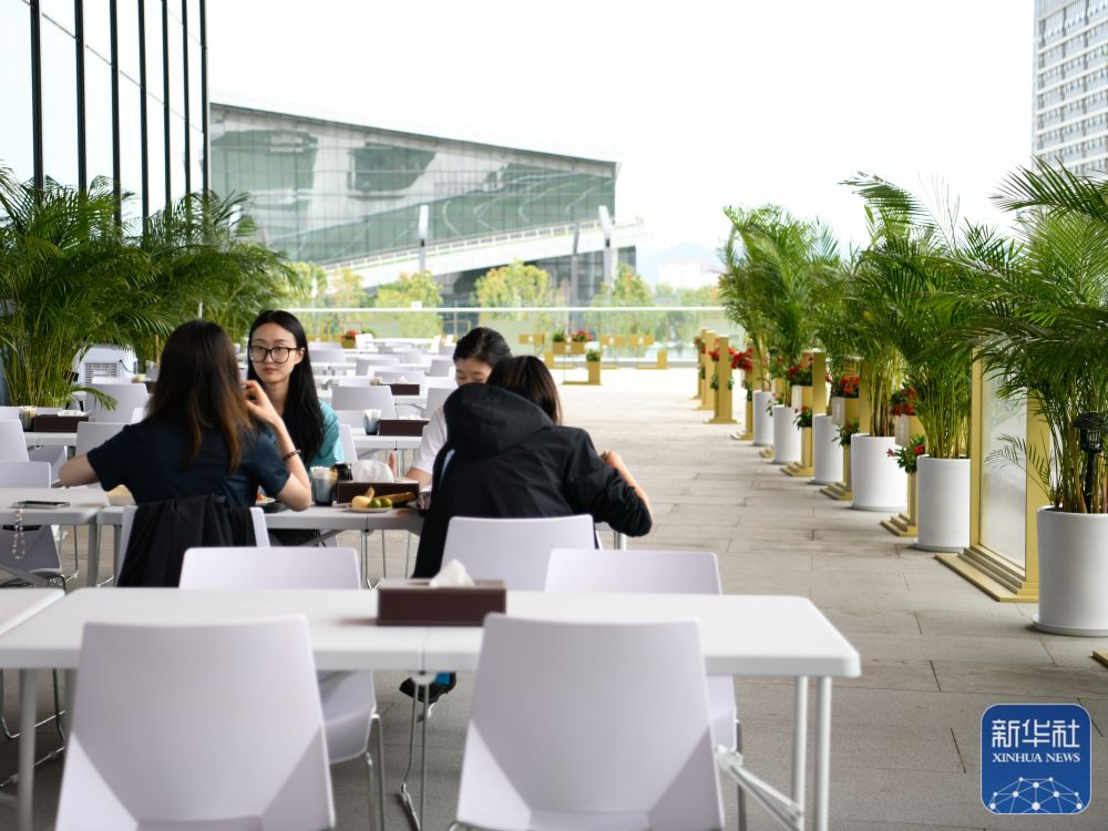 7月14日,工作人员在成都大运会主媒体中心媒体餐厅室外就餐区就餐。新华社记者 胥冰洁 摄
