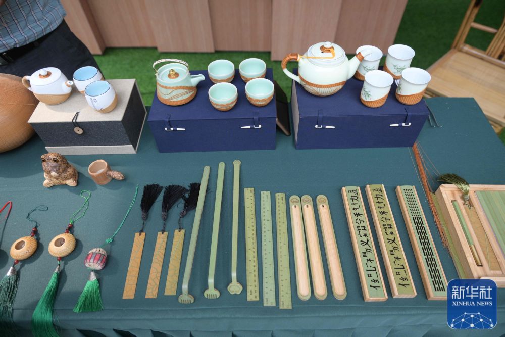 这是7月12日拍摄的主媒体中心传统文化传播区的四川竹编产品展示。新华社发(魏麟潇摄)